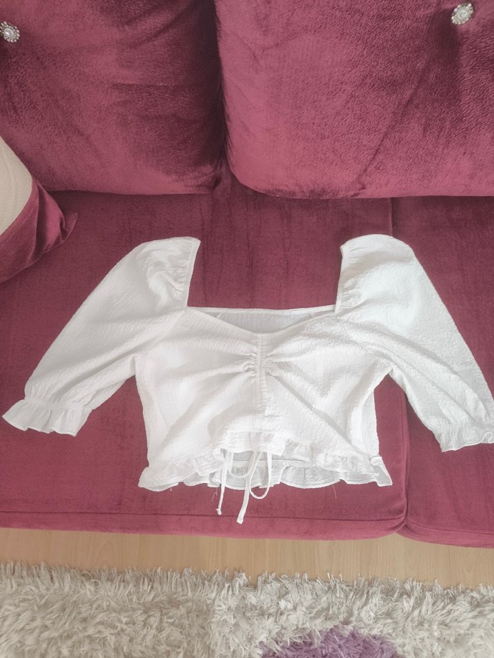 Beyaz bluz, tekne yaka ve kısa kollu. Salaş kesimi ve fırfır detaylarıyla günlük kullanıma uygun minimalist sokak stili sunar. fermuari vs sorunsuz çalışıyor