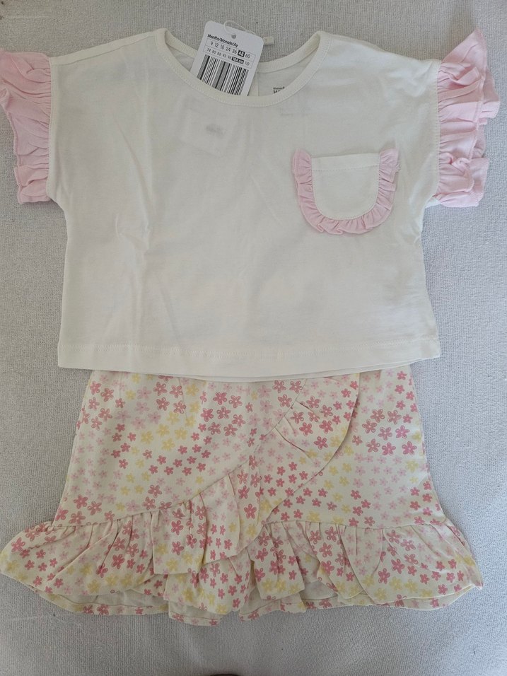 Etiketli, 4 yaş kız için kısa kollu beyaz üstü ve kol ve cep detaylarında fırfırlı, pastel renkli çiçek desenli fırfırlı etek takımı.