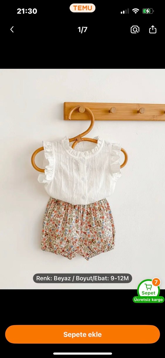 Beyaz fırfırlı ve nakışlı kısa kollu üst ile pastel tonlarda çiçek desenli şort içeren kız bebek takımı, 9-12 ay için uygundur.