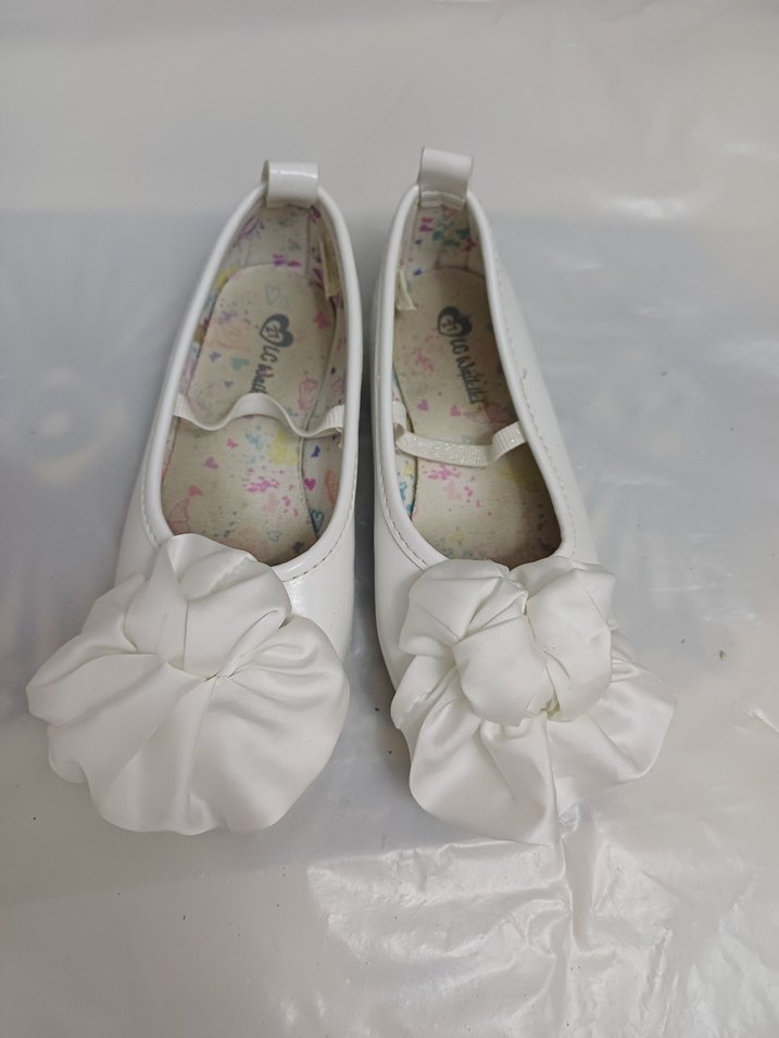 Beyaz fırfırlı kız çocuk babetler, iç kısmı pastel çiçek desenli, dayanıklı kauçuk malzemeden üretilmiştir. 27 numara