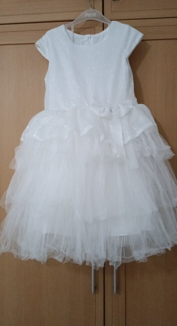 Yumuşak sentetik kumaştan, fırfırlı detaylı, straplez yakalı beyaz kız çocuk elbisesi. İki defa okul etkinliğinde giyildi.