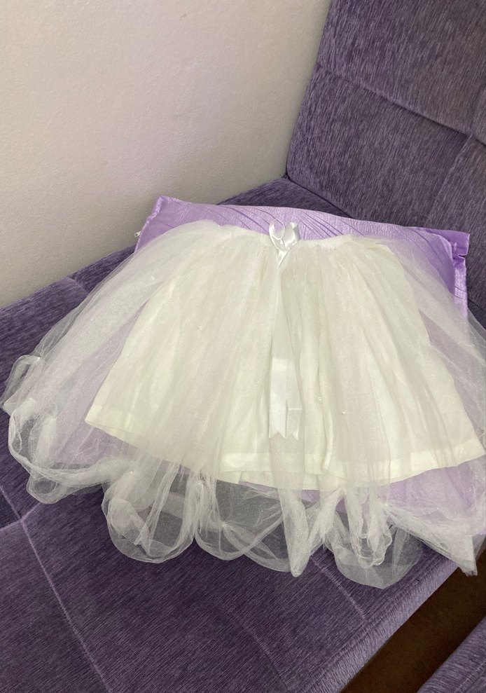 Beyaz, tülden yapılmış iç astarı ince satenk fırfırlı katmanlara sahip, fitted kesim kız çocuk eteği, pastel goth ve avangart tarz sunar. Bel esnektir