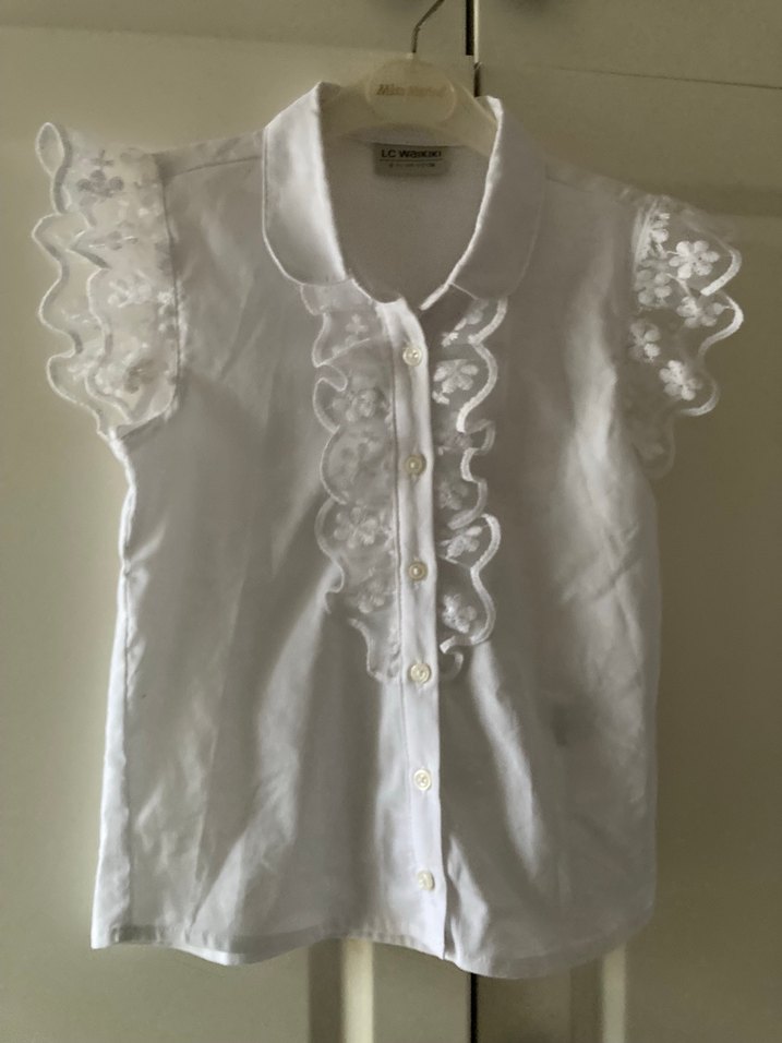 yakalı, kısa kollu, fırfırlı detaylara sahip, beyaz kız çocuk gömleği.
