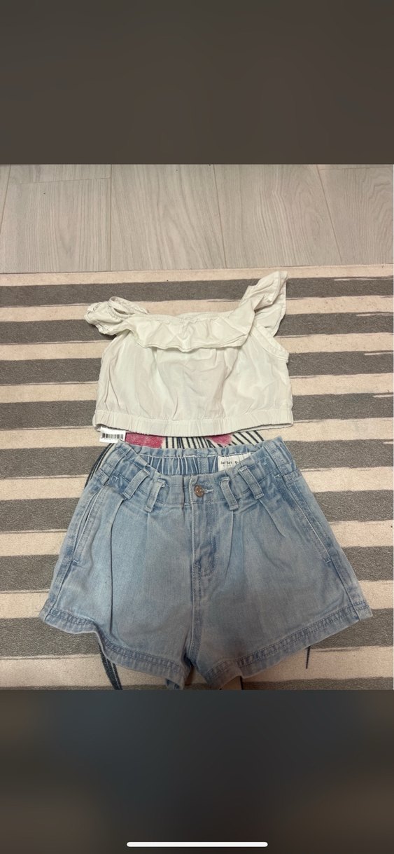 Gevşek kesim, açık renk kot şort, fırfırlı detaylı, beyaz düz üst ile kombinlenmiş. Rahat ve trend sokak stili için uygun.