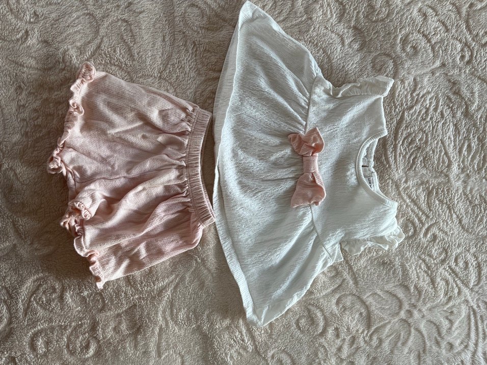 Beyaz kolsuz üst, fırfır detaylı ve pembe fiyonk süslemeli. Pastel pembe, lastikli bel şort ile kombinlenmiş. Yumuşak ve rahat kumaş.