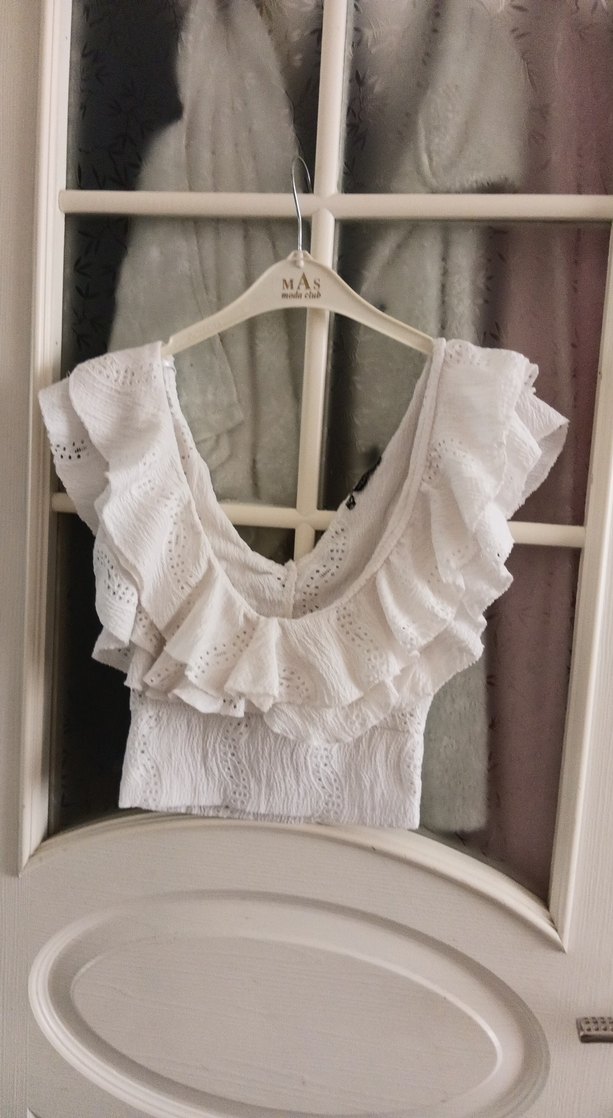 Beyaz keten kumaştan, V yaka ve fırfır detaylı, nakışlı kısa kesim, bohem tarzda kolsuz ve dar kesim bluz.