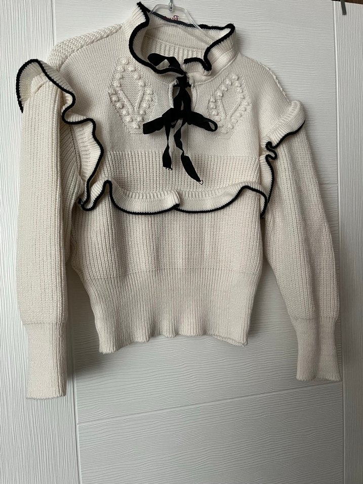 Beyaz fırfırlı kurdele detaylı kazak standart beden