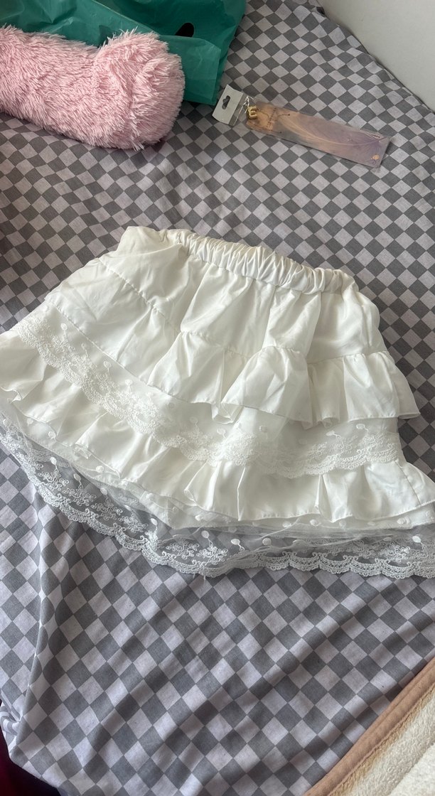 Beyaz midi etek, fırfırlı ve nakışlı detaylara sahip, rahat kesim ve yumuşak sentetik kumaştan üretilmiştir. İçi şortlu