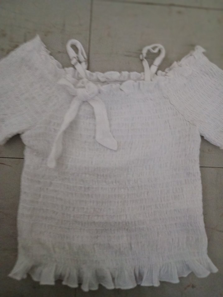 Beyaz yapılmış, fırfırlı ve askılı kısa kollu, mini boy, vücuda oturan bohem tarzda bluz. Günlük kullanıma uygundur. 1defa kulanildi yaşından küçükte giyebilir