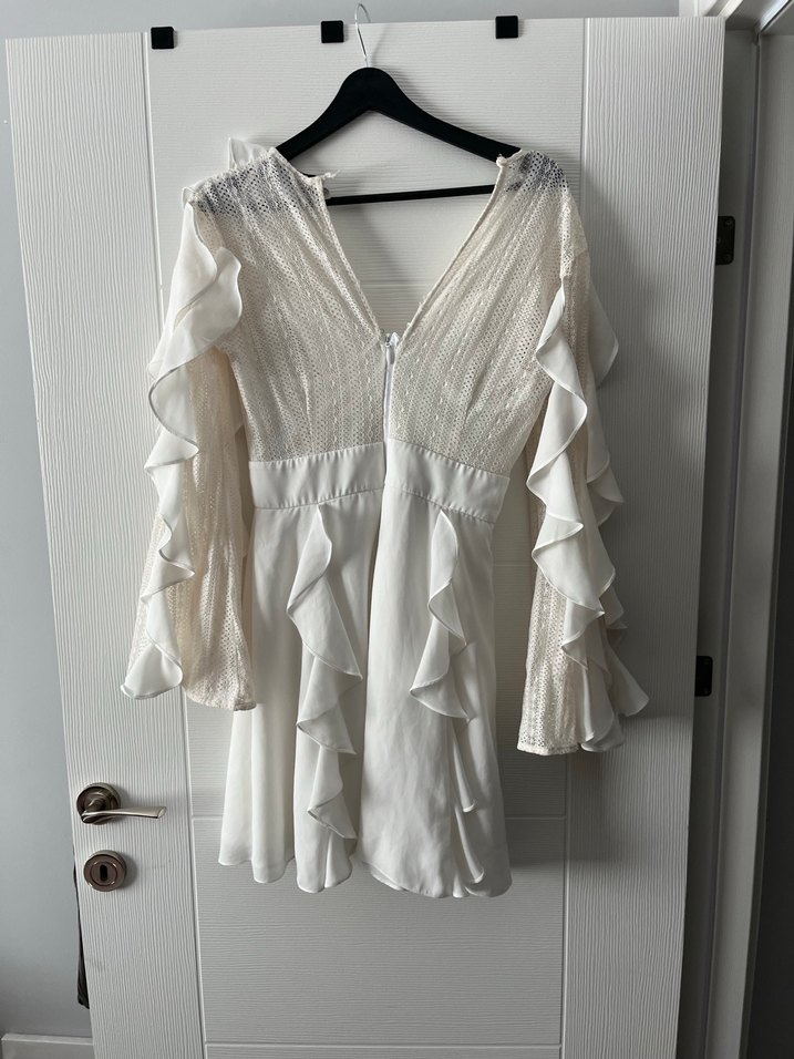 Beyaz Fırfırlı Mini Bohem Uzun Kollu Elbise