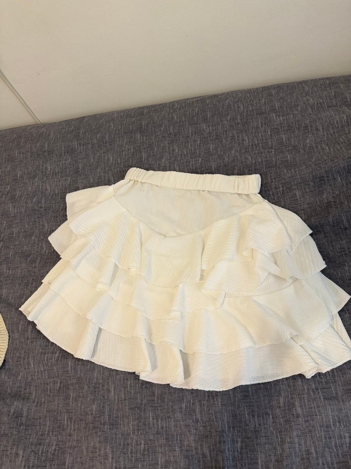 Yumuşak sentetik kumaştan, bol kesim beyaz mini etek, fırfır detaylı, bohem tarzda günlük kullanıma uygun. ✨