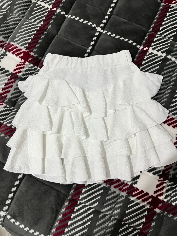 Yumuşak sentetik kumaştan, bol kesim ve kat kat fırfırlı beyaz mini etek. Kısa boyda ve düz desensiz, günlük sokak stili için uygun.