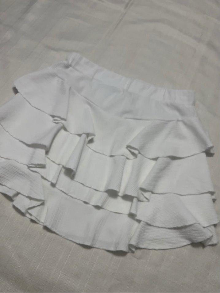 Sentetik kumaştan yapılmış, bol kesim beyaz mini etek, fırfır detaylarıyla günlük sokak stili için uygundur.