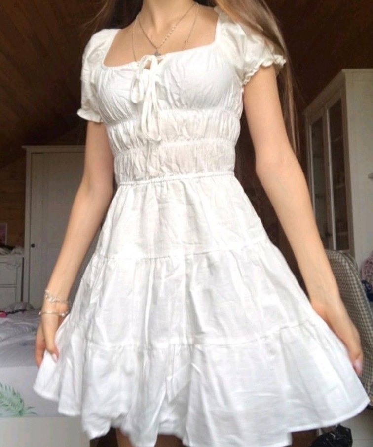 Bu beyaz mini elbise, keten kumaştan yapılmış, fırfırlı ve vücuda oturan kesime sahiptir. Askılı kollu ve kayık yaka, bohem tarz için uygundur.