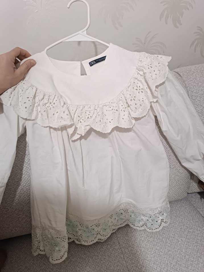 Pamuklu beyaz bluz, uzun kollu, yuvarlak yaka, bol kesimdir. Nakışlı fırfırlar yakada ve etekte bohem tarzı yansıtır.