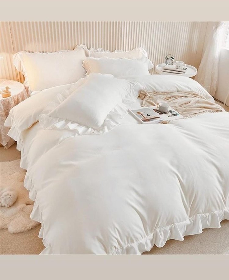 Pastel tonlarda beyaz, fırfırlı kenar detaylı yumuşak nevresim ve çarşaf takımı. ️
