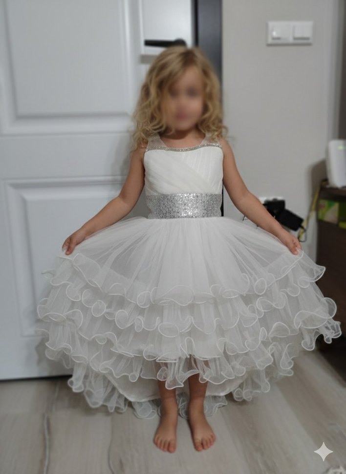 Beyaz, straplez yaka ve askılı, fırfırlı etekli, vücuda oturan çocuk abiye elbise. Yumuşak sentetik kumaştan, gümüş payet detaylı bel bandı ile bohem tarzda. ✨