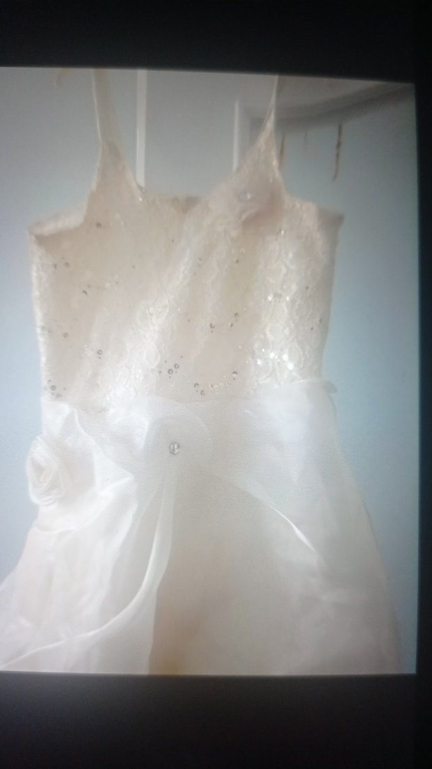 Beyaz, straplez, fırfırlı ve kolsuz çocuk elbisesi, yumuşak sentetik kumaştan yapılmıştır. Modern ve sade tasarıma sahiptir.