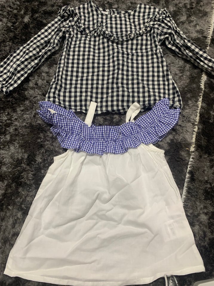 Bu beyaz kız bluzu, bol kesim ve fırfırlı straplez yakaya sahiptir. Yumuşak pamuk kumaştan üretilmiştir, trend sokak stili için uygundur. Beyaz hiç kullanılmadı kareli de 1 kere kullanıldı yeni tertemiz