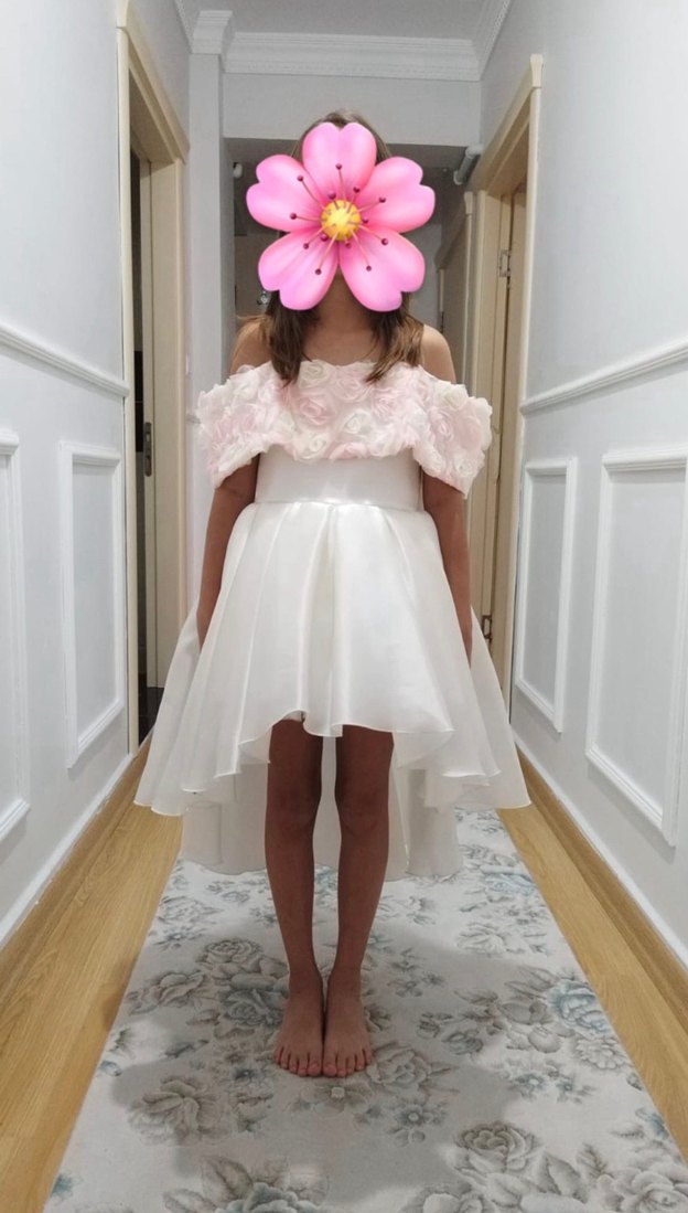 Beyaz, straplez yakalı, kısa kollu, fırfırlı detaylı, baskılı pastel desenli, sentetik kumaştan yapılmış modern kesim kız çocuk elbisesi. sadece bir defa giyildi