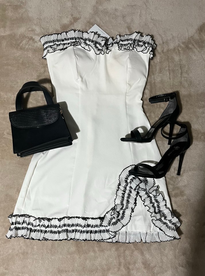 Beyaz, straplez ve mini uzunlukta, fırfır detaylı ve nakışlı desenlere sahip klasik şıklıkta ve sokak modasına uygun elbise. Etiketi üstünde hiç kullanılmamıştır.