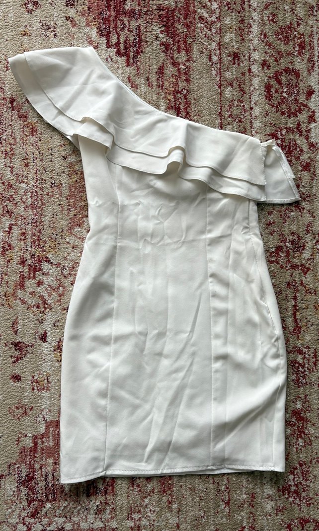 Beyaz, tek omuzda fırfır detaylı, straplez yaka ve kısa kollu, vücuda oturan midi uzunlukta abiye elbise. ✨