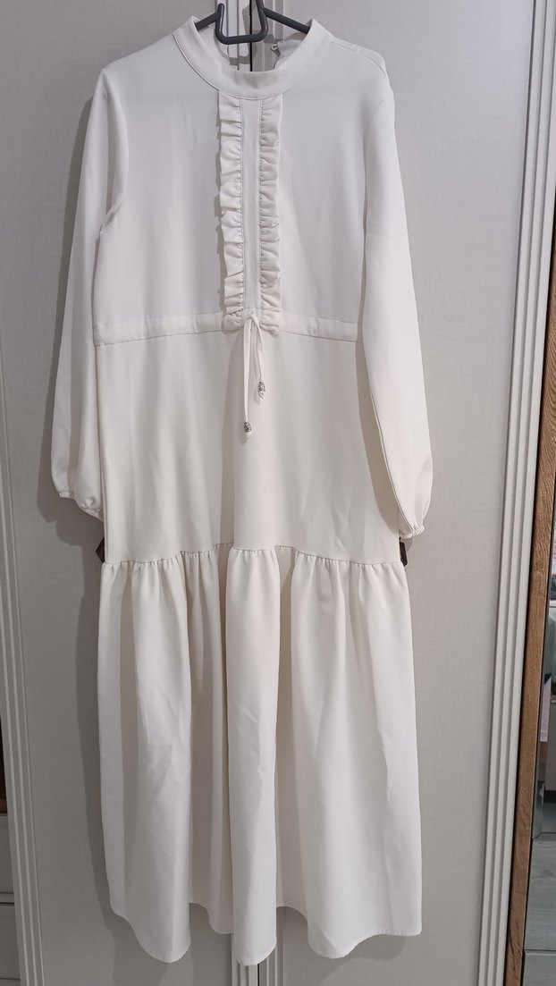 Beyaz ,yuvarlak yaka ve ön kısmında fırfır detaylara sahiptir. Pürüzsüz sentetik kumaştan, normal uzunlukta ve regular fit kesimlidir. Ofis ve Paris sokak modasına uygundur. kumaş çok güzel yumuşaktır önden gizli kemerlidir isterseniz sıktırarak isterseniz serbest kullanabilirsiniz. nikah için tercih edilebilir