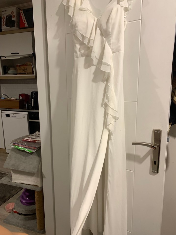 V yakalı, uzun beyaz elbise, ön kısmında fırfır detaylarıyla. Düz, sentetik dokulu kumaştan, klasik zarafeti ve Paris esintisini yansıtır. Kolsuz ve vücuda oturan kesim.