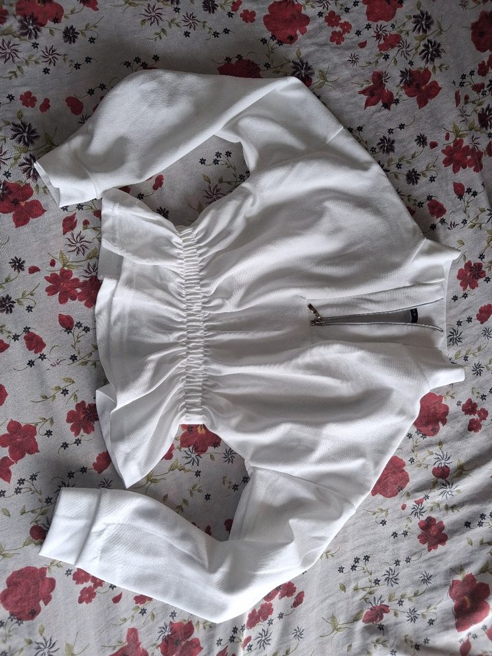 Yumuşak keten kumaştan, yüksek yakalı ve uzun kollu, bol kesim beyaz bluz. Midi boyda, fırfırlı detaylı ve arka fermuarlı, günlük kullanıma uygun Paris usulü sokak stili.