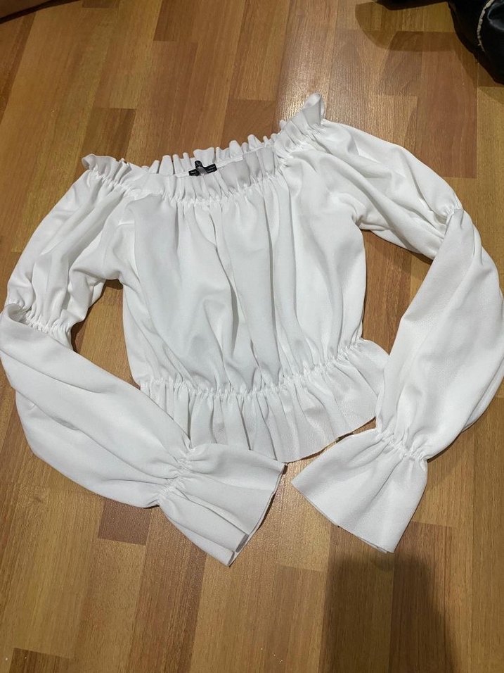Uzun kollu, kayık yaka beyaz bluz, fırfır detaylı ve bol kesim. Hafif keten kumaştan, günlük rahat sokak stili için uygun.