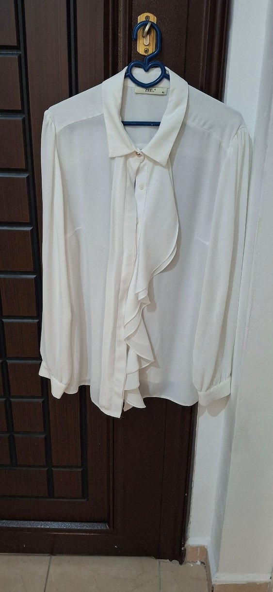 Beyaz, ipek gibi dokuda, uzun kollu ve yakalı kadın gömleği. Önde fırfır detayıyla bohem tarzda, rahat kesim ve klasik şıklık sunar.