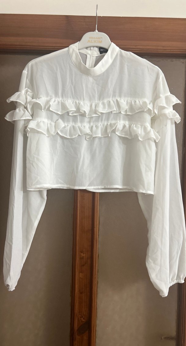 Yüksek yakalı, uzun kollu, keten kumaştan beyaz bluz. Göğüs kısmında fırfır detayları ve bol kesimi ile günlük kullanıma uygun.