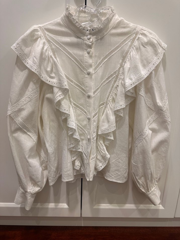 Beyaz keten gömlek, uzun kollu, yüksek yakalı ve nakışlı fırfır detaylara sahip. Salaş bohem kesim, günlük kullanım için uygun.