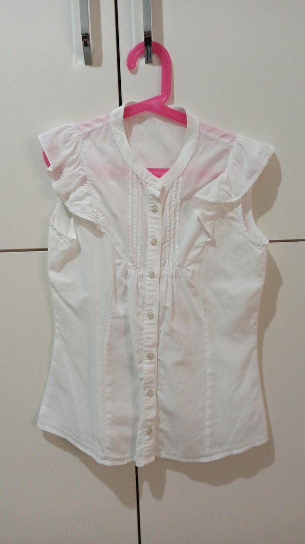 Pamuk kumaştan, kolsuz ve V yaka olan beyaz gömlek, omuzlarda fırfır detayına sahiptir. Son resimde omzunda delik olan yeri gösterdim.