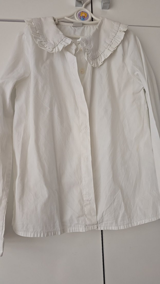 Beyaz keten gömlek, fırfırlı yaka ve uzun kolludur. Düğmeli ve bol kesimdir, günlük kullanım için uygundur.