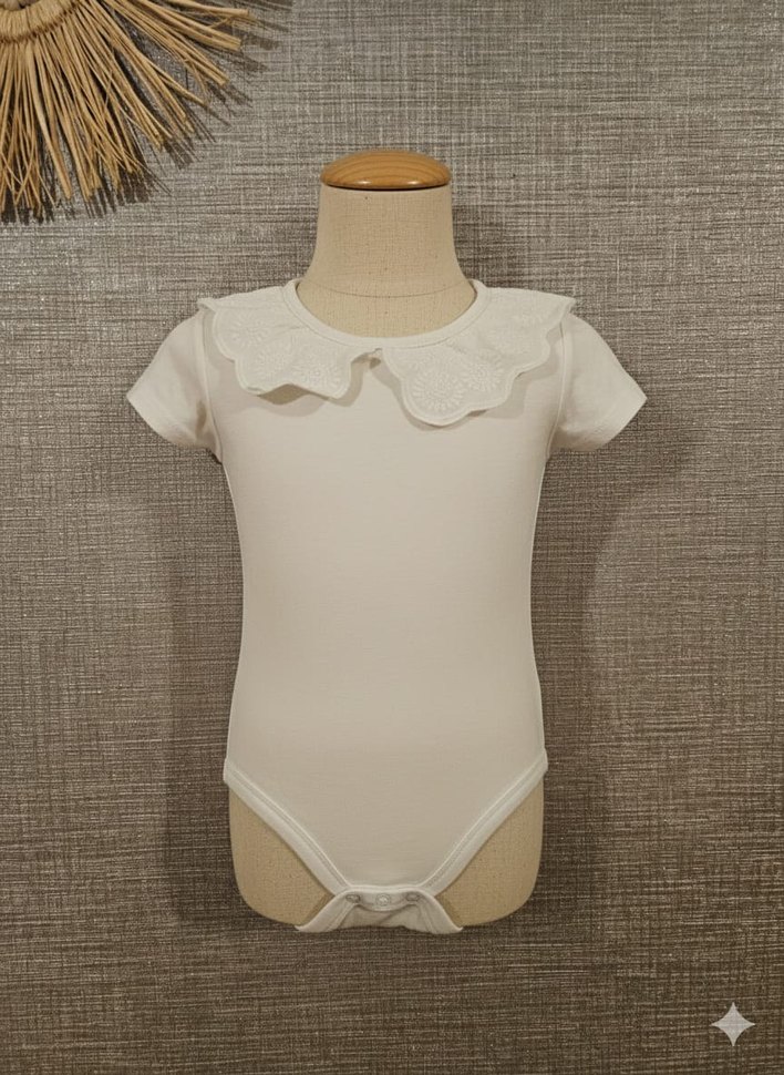 önünde hafif bi lekesi var ugrasilirsa cıkar kollu, beyaz renkli kız bebek body, fırfırlı yakaya sahiptir. Yumuşak pastel tonlardadır ve çıtçıtlı kapanışı vardır.