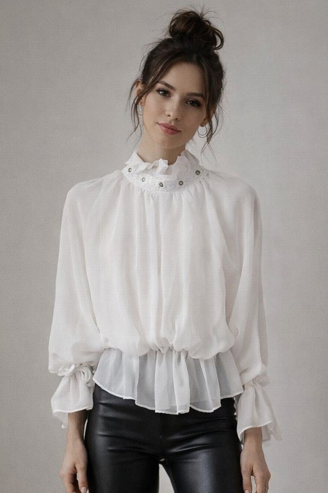 Yumuşak pamuktan yapılmış, beyaz, yüksek yakalı ve fırfırlı detaylara sahip, bol kesim uzun kollu bluz. Parlak yüzeyi ve rahat kesimiyle ofis için uygun.