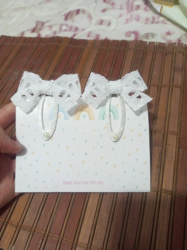 Beyaz renkli, dantel fiyonk detaylı, pastel desenli çocuk toka seti.