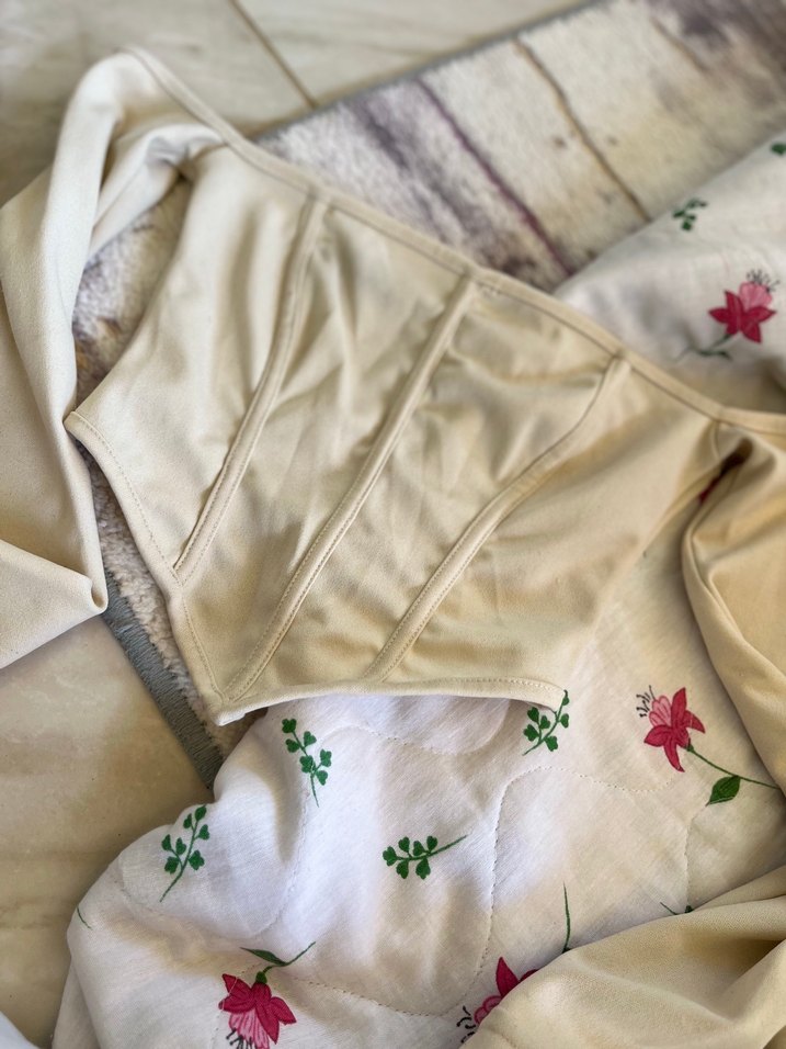 Beyaz renkte, fit kesimli ve korse detaylı bluz. Düz ve pastel tonlarda, üzerinde "2" detayı bulunur.