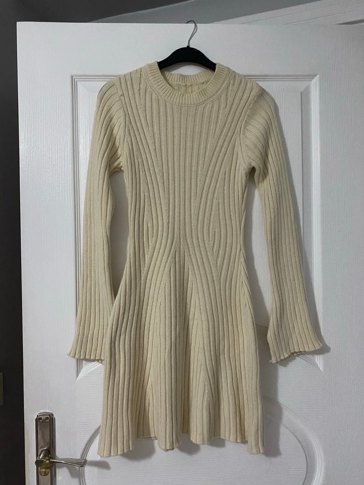 Beyaz fitilli triko midi elbise, uzun kollu . Yumuşak triko kumaşıyla günlük kullanıma uygun rahat ve şık bir görünüme sahiptir. ✨