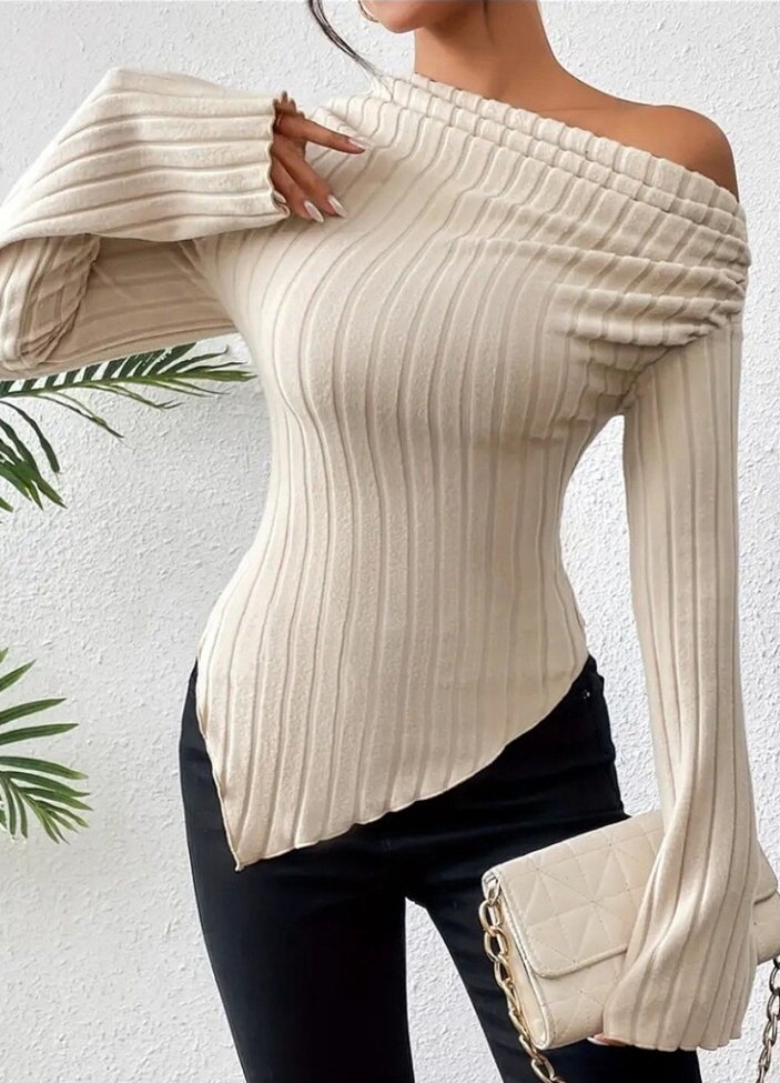 Krem renkli, fit kesim, V yaka ve uzun kollu triko bluz. Kayık yaka ve asimetrik etek ucu modern bir detay katıyor. Rahat kullanım için uygundur. M- l beden. Marka temsili #triko #bluz