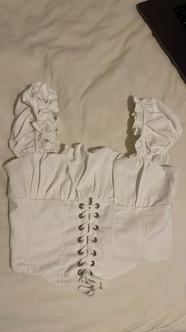 Beyaz renkte, fitted kesim midi boy hemşire korsesi. Ön kısmı bağcıklı ve omuzlarda büzgülü detaylar bulunur.