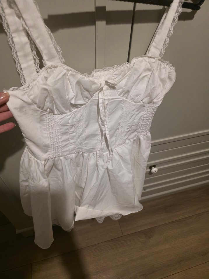 Bu beyaz hemşire korsesi, dantel detaylı askılar ve midi boyu ile fitted kesime sahiptir. Pastel ve desensiz görünümü rahat kullanım sunar. s beden uyumlu
