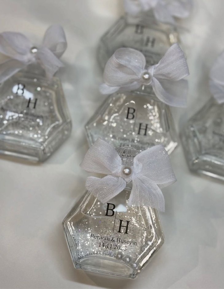 Şeffaf altıgen şişe üzerinde inci detaylı beyaz fiyonk bulunan kişiye özel hediye şişesi. 50 adettir