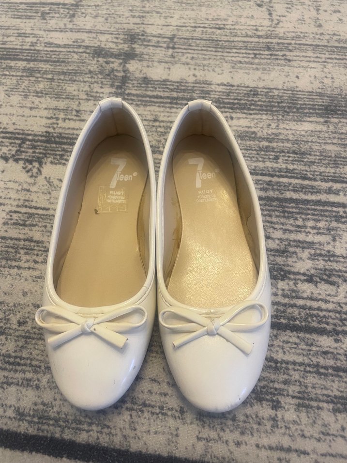 Beyaz renkli, fiyonk detaylı kız babetleri. Pastel tonlarda, sade ve kauçuk malzemeden üretilmiştir. Klasik şıklık için uygun. Çok az kullanılmıştır