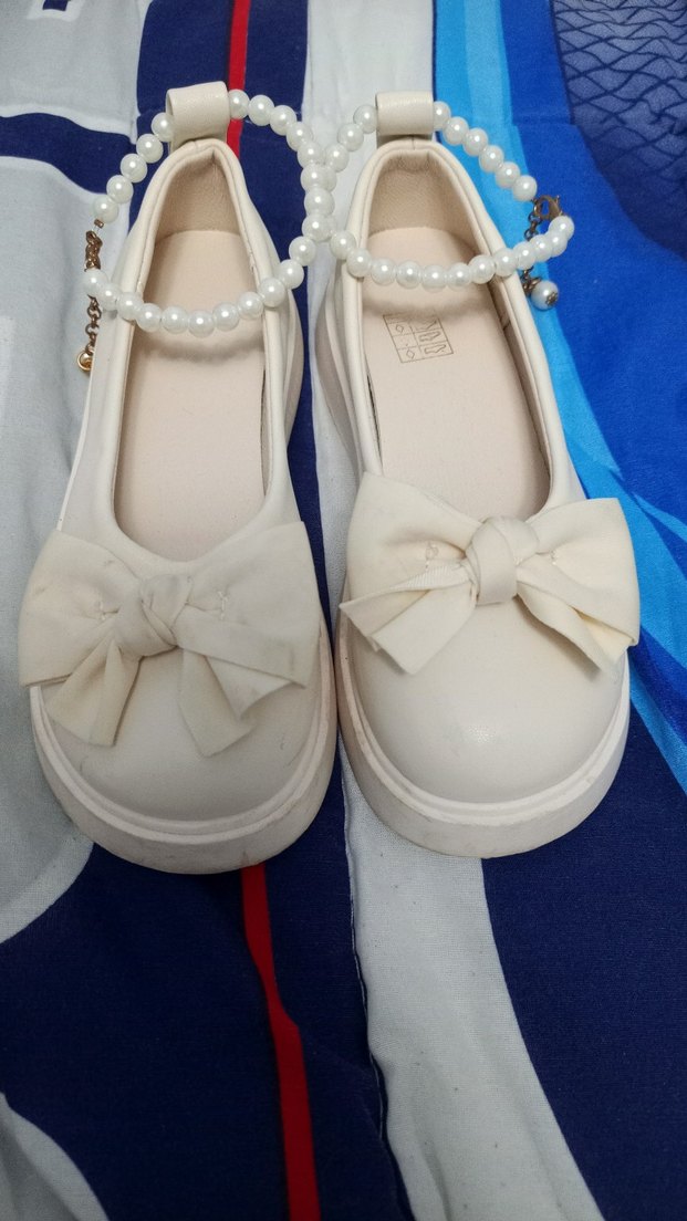 Beyaz renkli, fiyonk detaylı kız çocuk babetleri. klasik ve desen içermeyen pastel tonlarda. inci detayli bağlama ipi bir defa giyildi kirik beyaz rengi