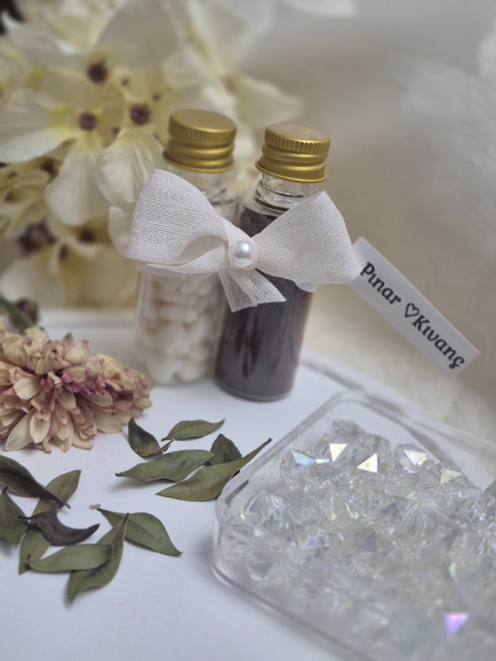 Altın kapaklı iki küçük şişe, biri kalpli diğeri kahve Beyaz fiyonk ve etiketle süslenmiş. Kurutulmuş çiçek ve kristal aksesuarlar eşlik ediyor.