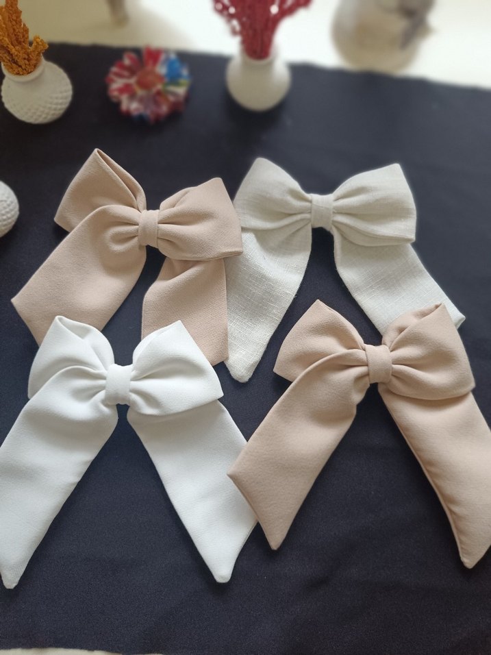 Yumuşak sentetik kumaştan yapılmış beyaz fiyonk saç aksesuarı, modern klasik tasarıma ve hafif Paris etkisine sahip. Pastel tonlarda sade stil için uygun.