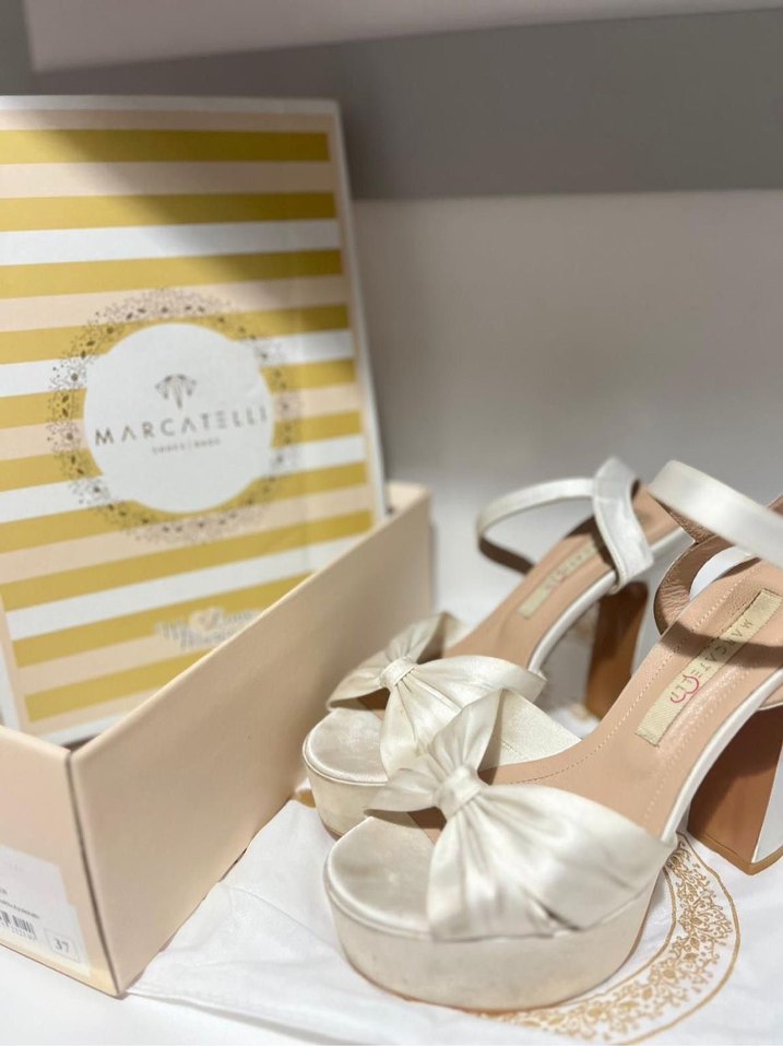 İpek gibi beyaz platform topuklu, nakış detaylı ve fiyonk süslemeli, düğünler için uygun, çağdaş Paris tarzında MARCATELL marka ayakkabı.