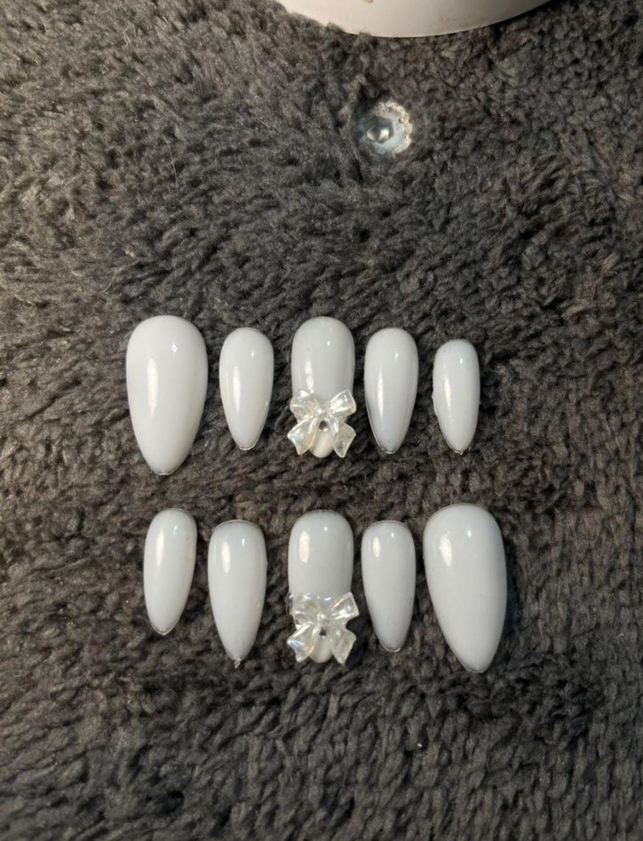 Parlak beyaz takma tırnaklar, iki tırnakta fiyonk detaylı süslemeyle. Farklı boyutlarda, rahat kullanım için uygun.